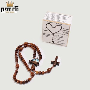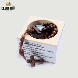 Construído em madeira, com fio de poliéster encerado, contas de 8 mm e 6 mm e cruz entalhada
