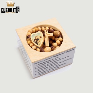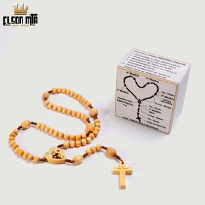 Construído em madeira natural clara, com fio de poliéster encerado, contas de 8 mm e 6 mm e cruz entalhada