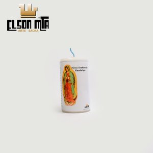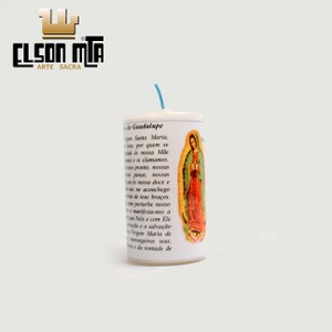 Construída em parafina pura, pavio, imagem, oração e celofane biodegradável